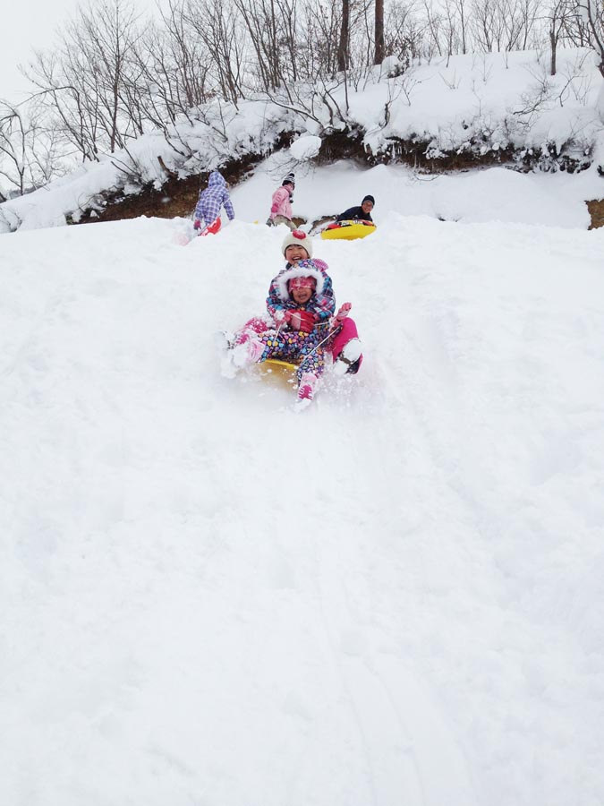 姉妹仲良くソリ滑りです。子ども達が考えていた以上に面白かったようで、お昼ご飯も忘れるくらいに遊んでいました。